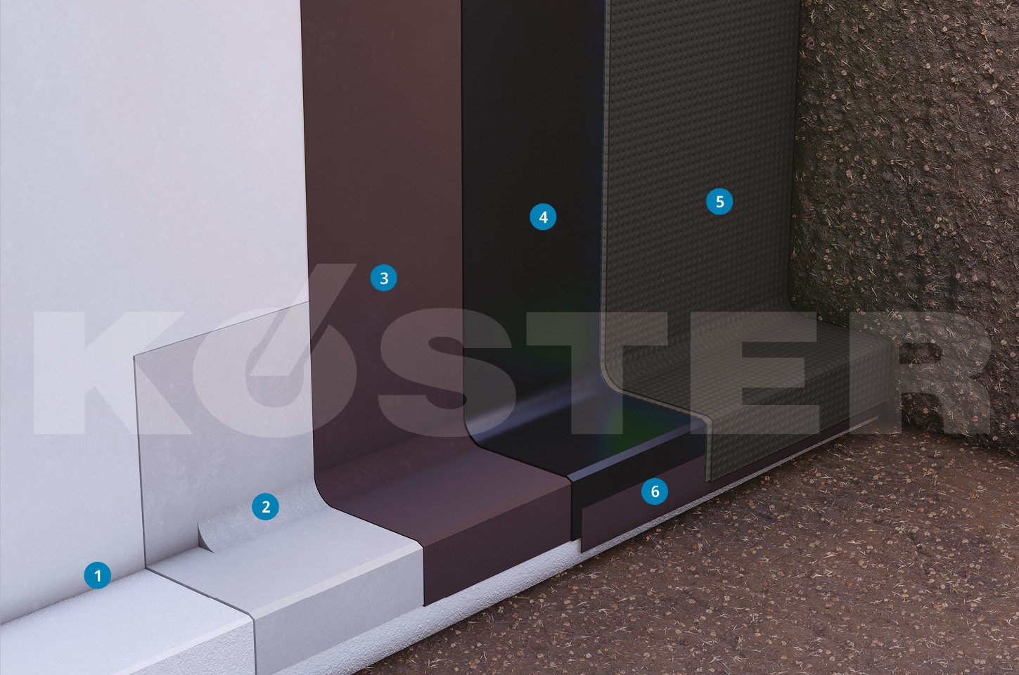 Apply a primer coat of KÖSTER KBE Liquid Film on clean, solid substrates. Pipe penetrations are sealed using flanges cut to size from KÖSTER KSK Membranes. In areas especially in danger of water creeping behind the waterproofing such as wall-floor junctions, a substrate preparation with KÖSTER NB 1 Grey mixed with KÖSTER NB 1 Flex is applied. To avoid stresses in the elastic waterproofing, rounded fillets made of KÖSTER Repair Mortar Plus are installed in interior corners.