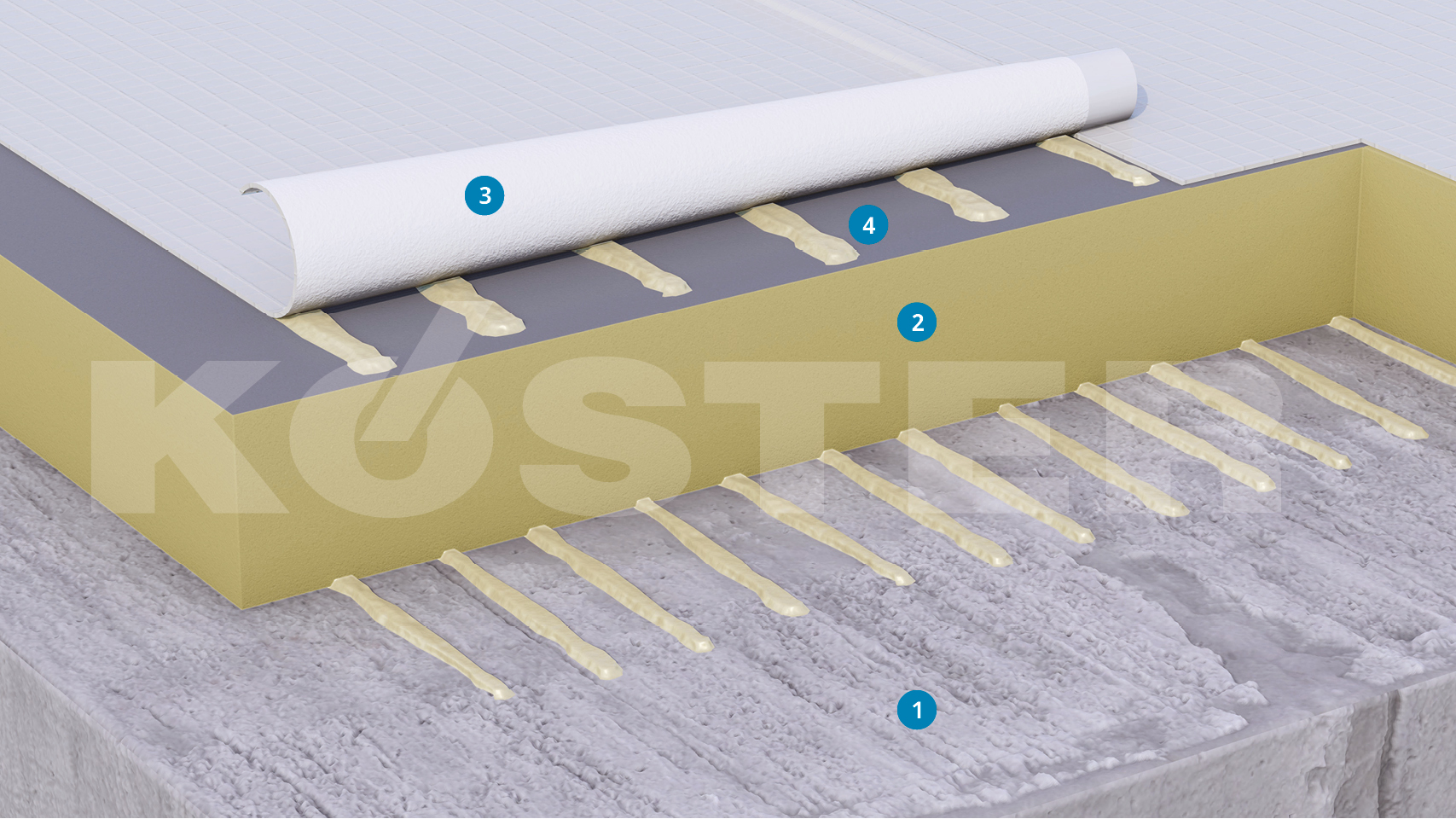 The KÖSTER PUR Membrane Adhesive is applied in strips to the substrate, before unrolling the fleeceback coated KÖSTER TPO Membrane. The membrane is then firmly pressed onto the substrate using a cylinder in the same width of the membrane. This enables the adhesive to be spread evenly and help achieve uniformity of the bond. When distributing the adhesive care must be taken to ensure that no adhesive on the welding edges is spread.