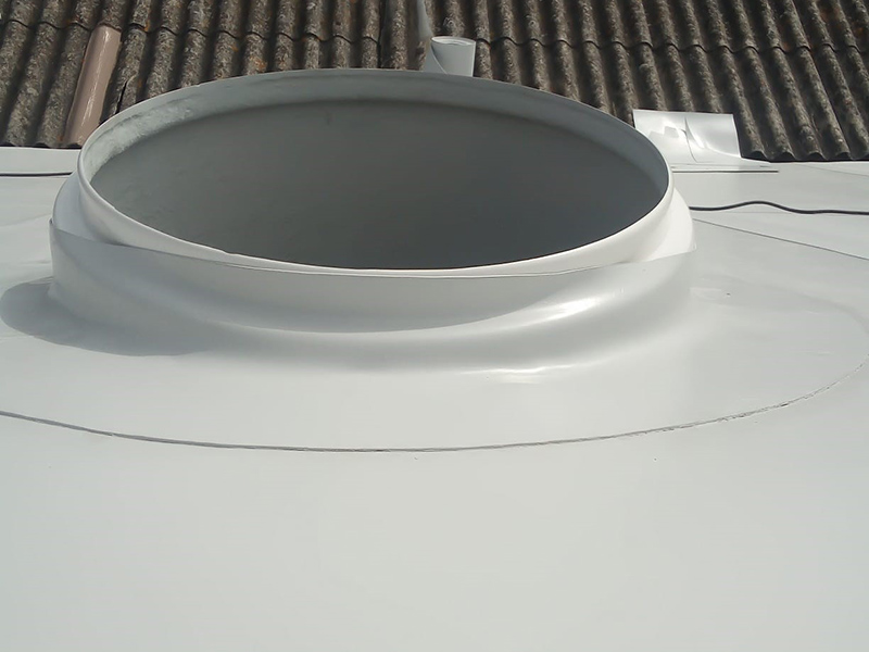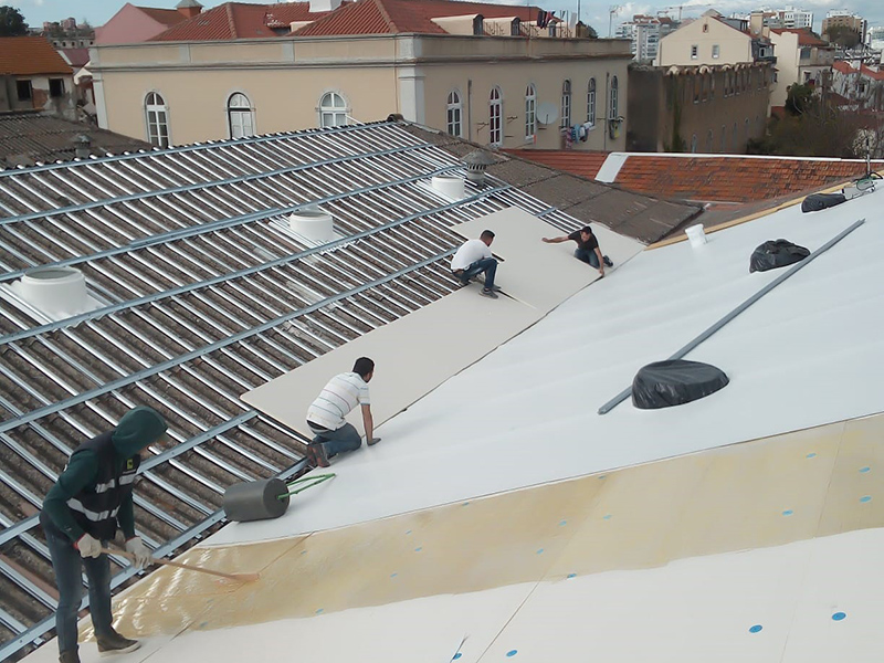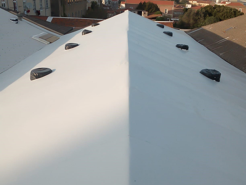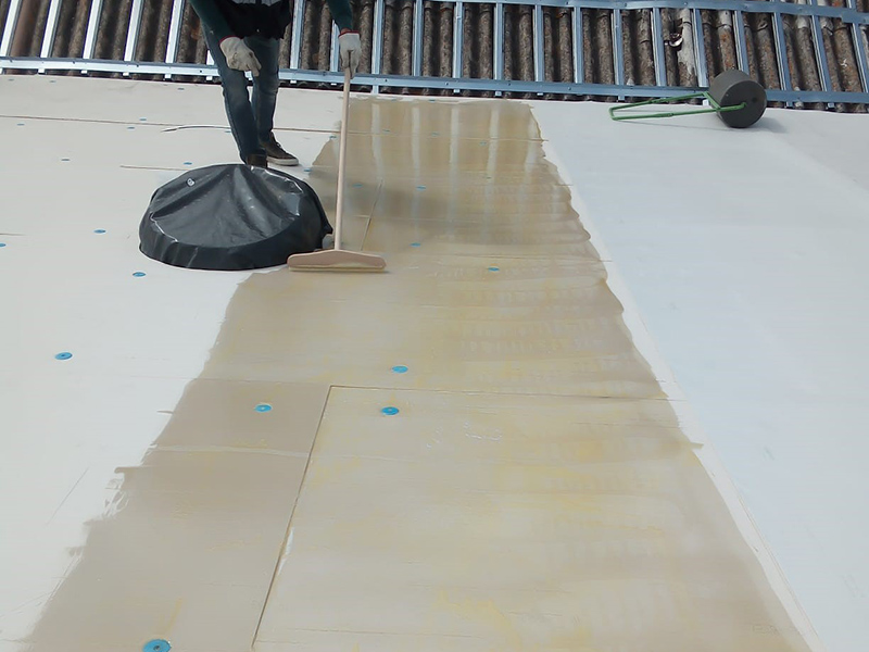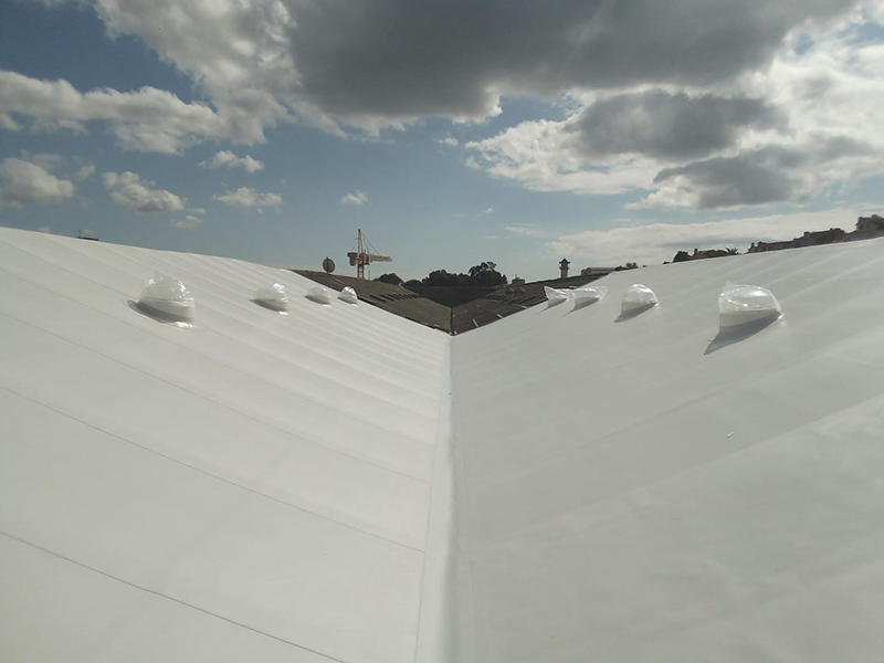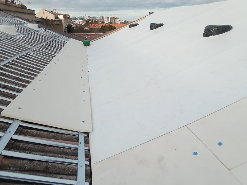 Highly sloped very old asbestos structure was initially created a custom light weight metal frame structure as a structural reinforcement and as frame basis for the PIR insulation boards. Then the KÖSTER PUR Membrane Adhesive was applied and the KÖSTER TPO 1.5 F adhered to the insulation boards directly.